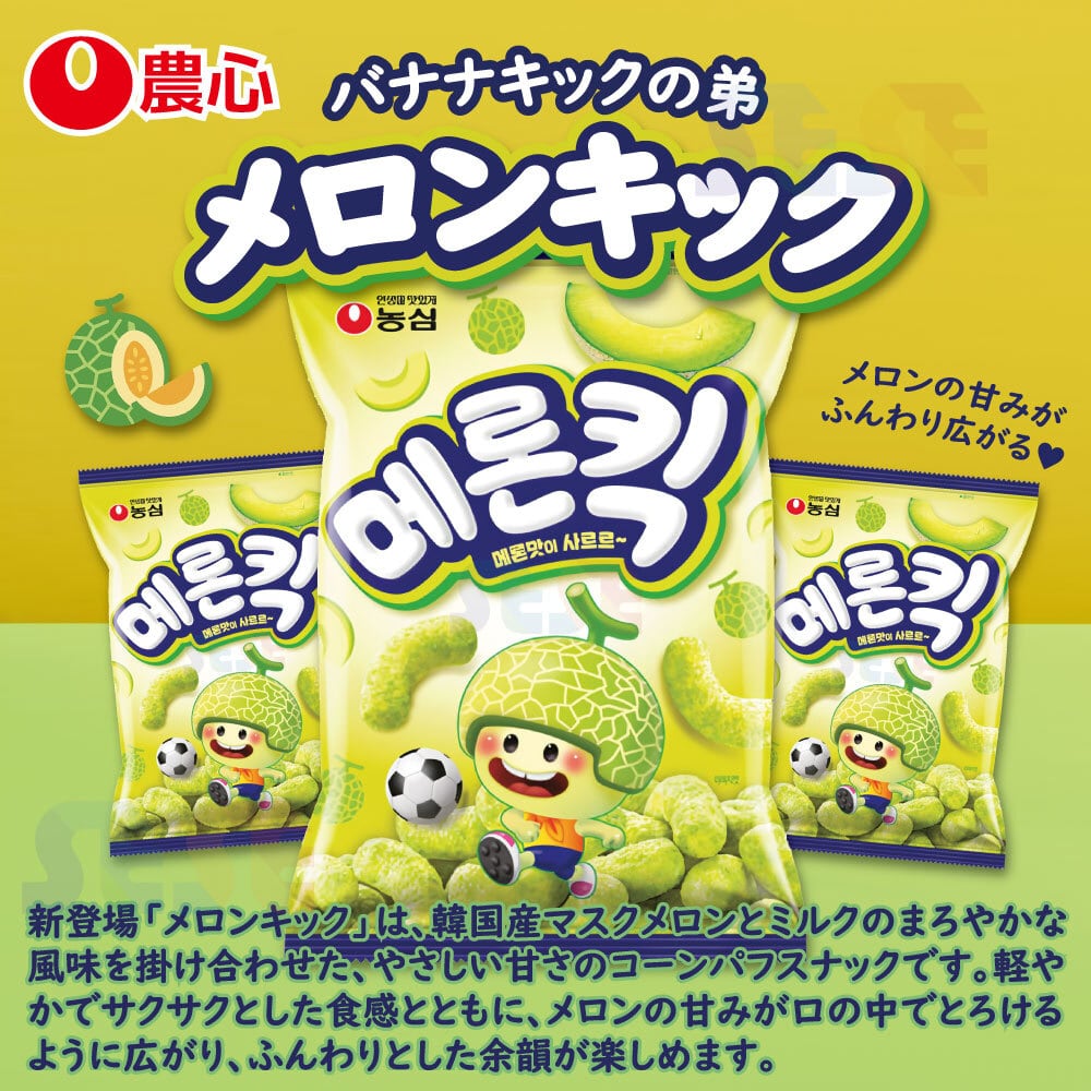 新登場「メロンキック」は、韓国産マスクメロンとミルクのまろやかな風味を掛け合わせた、やさしい甘さのコーンパフスナックです。